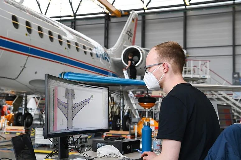 Julian Sinske 于2013年加入DLR,自2018年起擔(dān)任結(jié)構(gòu)動態(tài)測試團隊負責(zé)人一職。他解釋了GVT的目標和條件:”一般來說,地面振動測試只在首飛前六到八周進行——在這個時間范圍內(nèi),該程序必須有效地執(zhí)行。在測試中,飛機被安裝好,使其行為類似于飛行中的行為——盡可能地排除由于起落架和輪胎造成的阻尼影響。GVT的實驗結(jié)果可以用來驗證制造商的仿真模型。在大多數(shù)情況下,這是進一步對原型進行飛行測試的先決條件。"